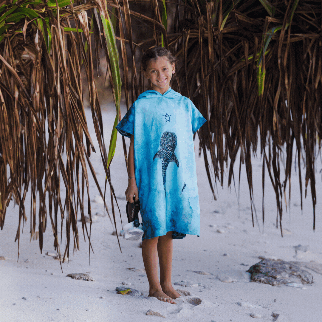 Made from our signature waffle weave fabric that is created from post consumer waste. Each kids poncho recycles approx 20 - 25 plastic bottles!